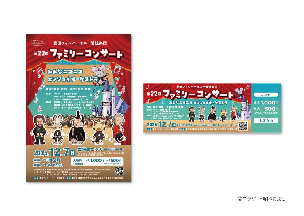 毎年ご依頼いただいているファミリーコンサート。年度ごとに変わる曲目からイメージをお伝えいただき、それを膨らませ、親しみやすさやワクワク感をデザインに込めています。音楽の楽しさを伝え、家族みんなが待ち遠しくなるようなチラシに仕上げました。